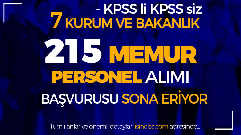 Kamuya memur personel alımı başvurularında sona geldik. 7 Bakanlık ve Kamu kurumu KPSS li KPSS siz 215 memur personel alacak. İlanlara henüz başvuru yapmamış olan adaylar için İşin Olsa ekibi olarak bir kez daha ilan detaylarını aktaracağız.
