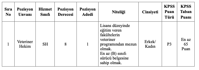 Belediye Sağlık Hizmetleri sınıfında 8. dereceli kadroda istihdam edilmek üzere Kadın Erkek adaylar içerisinden 1 Veteriner Hekim alınacak.