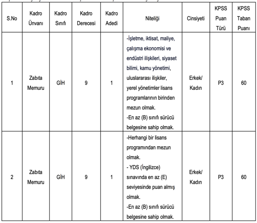 - Zabıta Memuru alımı için adayların Lisans sevyesinde KPSp3 puan türünden en az 60 puan almış olmak,