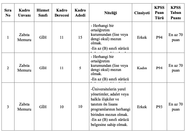 - 2024 yılında yapılan KPSS den Lise için P94 puan türünden ve Ön Lisans için P93 puan türünden en az 70 puan almış olmak gereklidir.