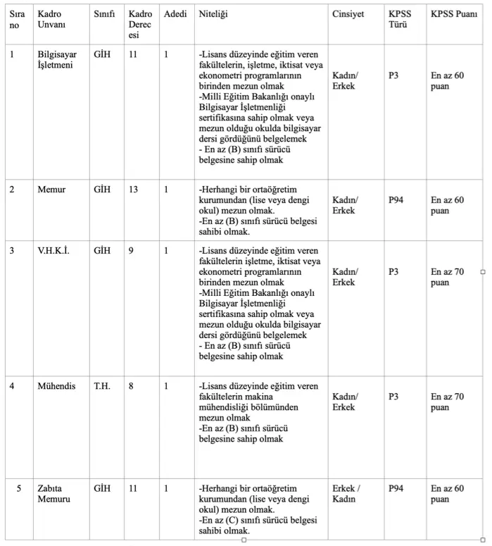 Belediye Genel İdare Hizmetleri sınıfında ve Teknik Hizmetler sınıfında olmak üzere 8. 9. 11. ve 13. dereceli kadroda olmak üzere;