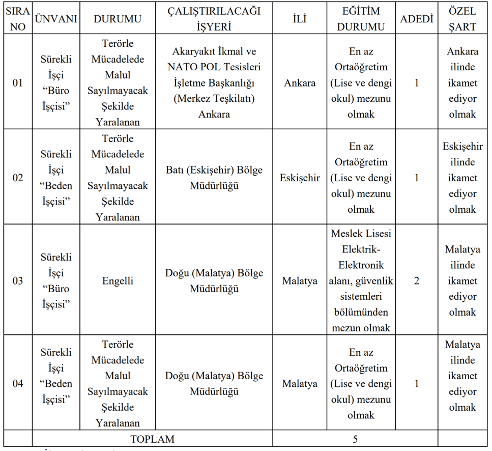 Milli Savunma Bakanlığı Akaryakıt İkmal ve NATO POL Tesisleri İşletme Başkanlığı çeşitli illerde görevlendirilmek üzere toplam 5 sürekli kamu işçisi alımı yapacağını duyurdu. Alımlar engelli bireyler ile terörle mücadelede malul sayılmayacak şekilde yaralanan adaylara yönelik olarak gerçekleştirilecek.
