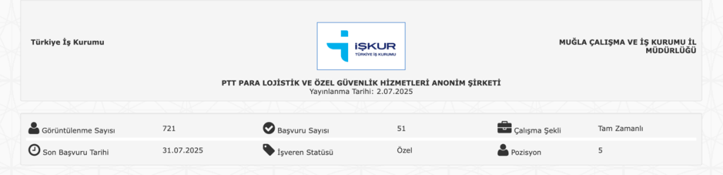 PTT Para Lojistik ve Özel Güvenlik Hizmetleri A.Ş., KPSS şartı aranmaksızın Muğla Menteşe’de 5 güvenlik görevlisi alımı yapacağını duyurdu. İlan, Türkiye İş Kurumu (İŞKUR) aracılığıyla yayımlandı.