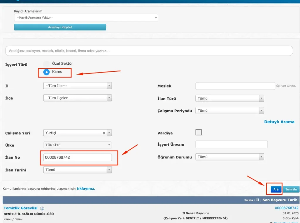 İŞKUR üzerinde başvuru için Öncelikle Kamu seçeneğini seçiyoruz ve ilan numarası yazan kısma yukarıdkai ilan numaralarını yazarak direk ilanlara ulaşabilirsiniz.