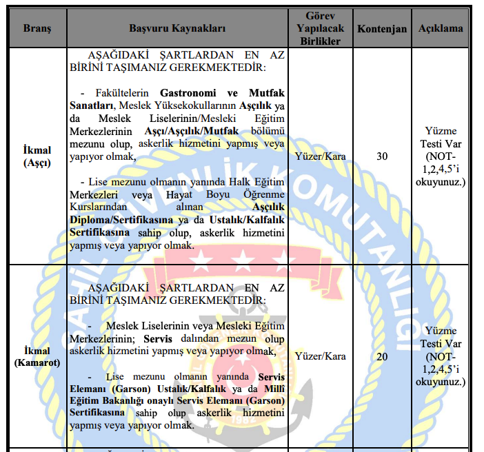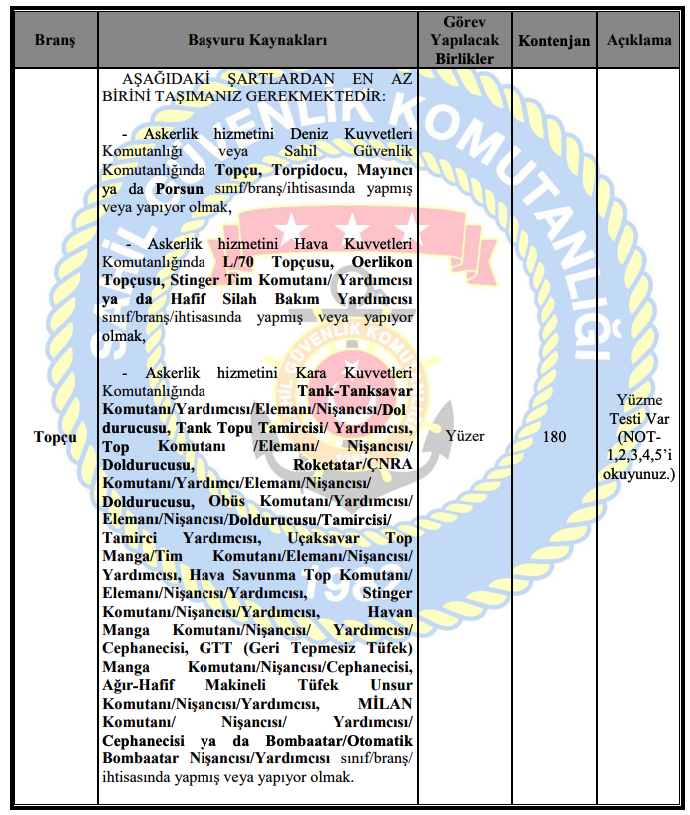 • Askerlik hizmetini Deniz Kuvvetleri Komutanlığı veya Sahil Güvenlik Komutanlığında Topçu, Torpidocu, Mayıncı ya da Porsun sınıf/branş/ihtisasında yapmış veya yapıyor olmak,