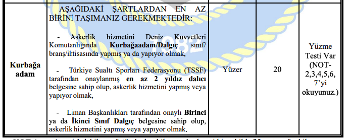• Askerlik hizmetini Deniz Kuvvetleri Komutanlığında Kurbağaadam/Dalgıç sınıf/ branş/ihtisasında yapmış ya da yapıyor olmak,
