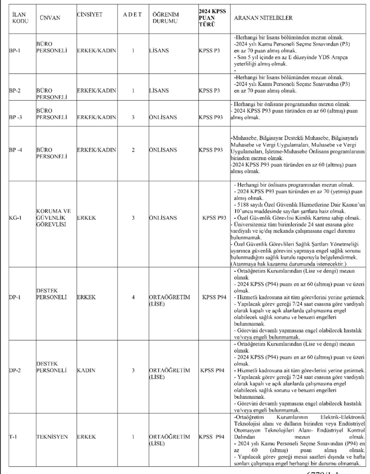 Üniversite adaylardan genel olarak 657 Sayılı devlet memurları kanunun 48. maddesindeki şartlar aranacak. Bu kapsamda ” Türkiye cumhuriyeti vatandaşı olmak, Kamu haklarından mahrum olmamak, Görevini yapmasına engel herhangi bir sağlık sorunu olmamak, Herhangi bir suç hükümlülüğü olmamak ” gibi şartlar aranacak.