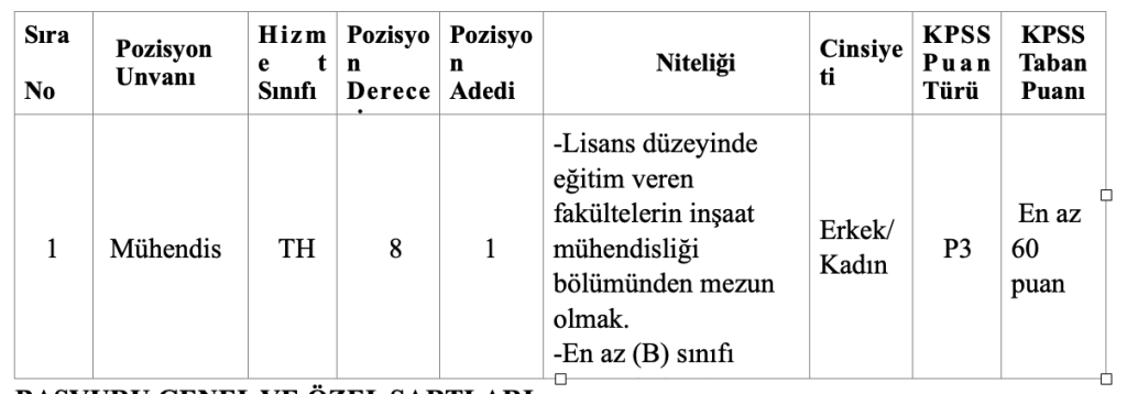 Belediye bünyesine sözleşmeli kapsamında olmak üzere 1 Mühendis alımı gerçekleştirilecek.