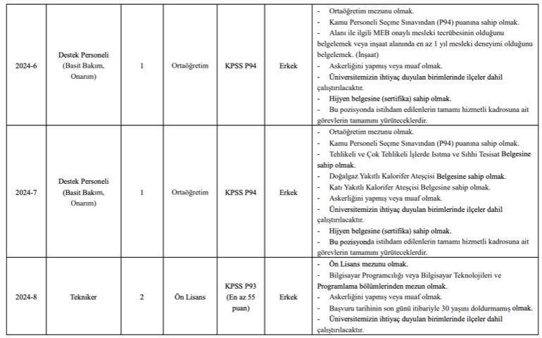 Üniversite personel alımı başvuruları 25 Mart 2024 tarihi ile başlamış olup en geç 8 Nisan 2024 tarihine kadar gerçekleştirilmesi gerekmektedir. Başvurular sadece istenen belgelerle birlikte şahsen veya posta yolu ile gerçekleştireceklerdir.